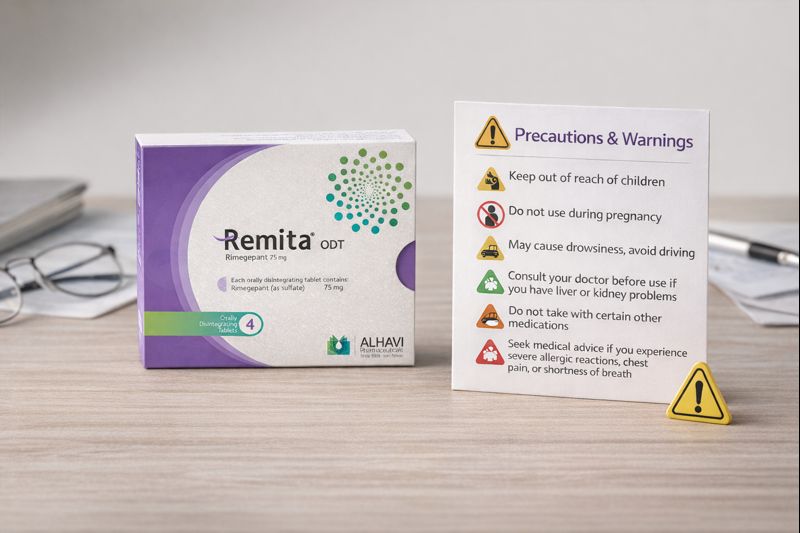 - نحوه مصرف: رمیتا به گونهای طراحی شده که مصرف آن آسان باشد، به ویژه در زمان حمله میگرن که ممکن است بلع قرص معمولی (مثلا به دلیل تهوع) دشوار باشد. هر قرص حاوی ۷۵ میلیگرم ریمیجپانت است. قرص را تا لحظه مصرف داخل بستهبندی نگه دارید. با دستهای خشک، قرص را از بسته خارج کنید و روی زبان قرار دهید.اجازه دهید قرص به طور طبیعی در دهان حل شود (چند ثانیه طول میکشد)؛ نیازی به جویدن یا بلعیدن با آب نیست.دوز و زمان مصرف دقیق را پزشک متخصص بر اساس شرایط شما تعیین میکند. رعایت دقیق دستورالعملهای تجویزی بسیار مهم است تا بهترین نتیجه حاصل شود و از مصرف بیش از حد جلوگیری گردد.